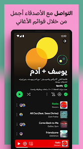 Spotify منصة تواصل اجتماعي سهلة الاستخدام. شارك قوائم التشغيل مباشرةً مع أصدقائك أو انشر ما تستمع إليه عبر منصات التواصل الاجتماعي. تابع أذواق أصدقائك الموسيقية وشاهد ما يستمعون إليه على Spotify. إنها حفلة موسيقية مفتوحة للجميع، والجميع مدعوون.